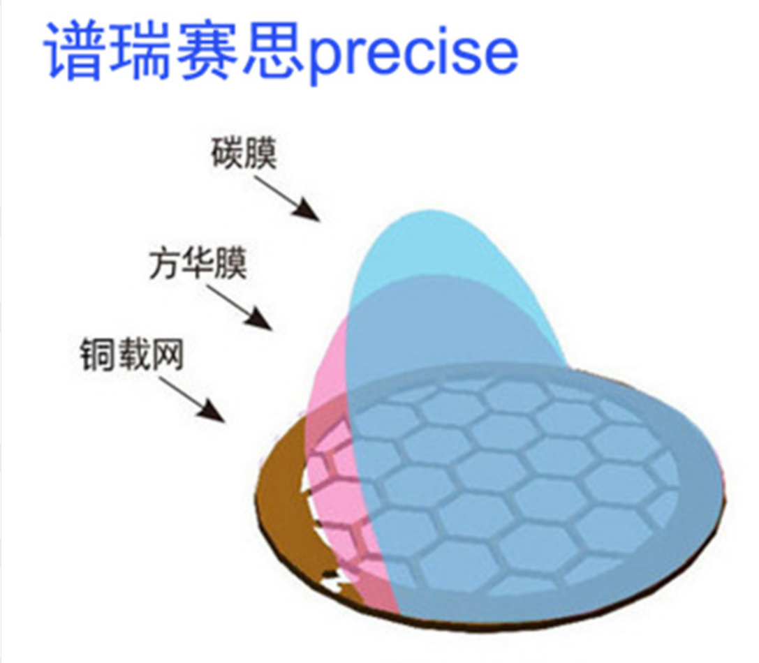 普通碳支持膜是一种常见并被广泛使用的一种支持膜,为两层支持膜结构,可以采用不同规格的载网做载体。从空间结构来讲,从下到上依次为载网,方华膜和碳膜,它是在一层有机方华膜上再覆盖一层碳膜。由于碳层具有较强的导电以及导热性,弥补了无碳方华膜的荷电效应以及热效应,