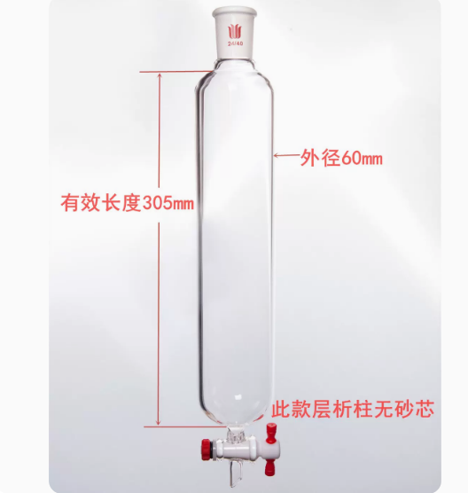 本品系国外普遍使用的低压闪式层析柱,请参阅文献W.C.Still, M. Kahn and A. Mitra of Columbia University inJOURNAL OF ORGANIC CHEMISTRY 43, 2923 [1978]。厚壁设计以提高加压时的安全性,每个层析柱标配一个四氟节门塞。