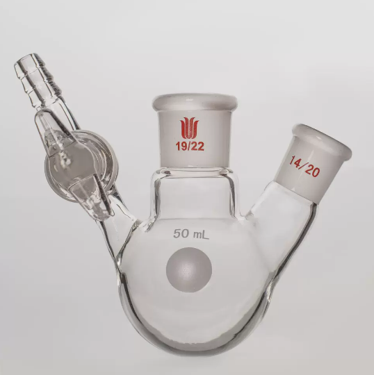 玻璃节门两口反应瓶,容量:50ml,主口:19/22,侧口:14/20