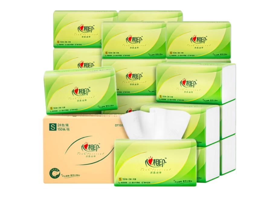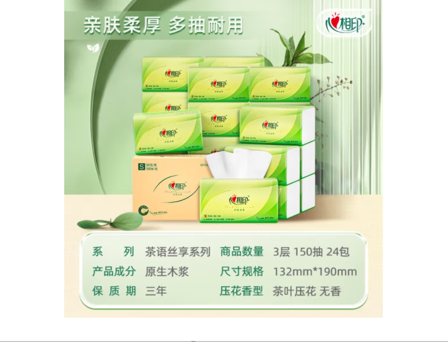 云杉生物 心相印 抽纸 茶语丝享 真S码3层150抽*24包 纸巾(整箱销售)