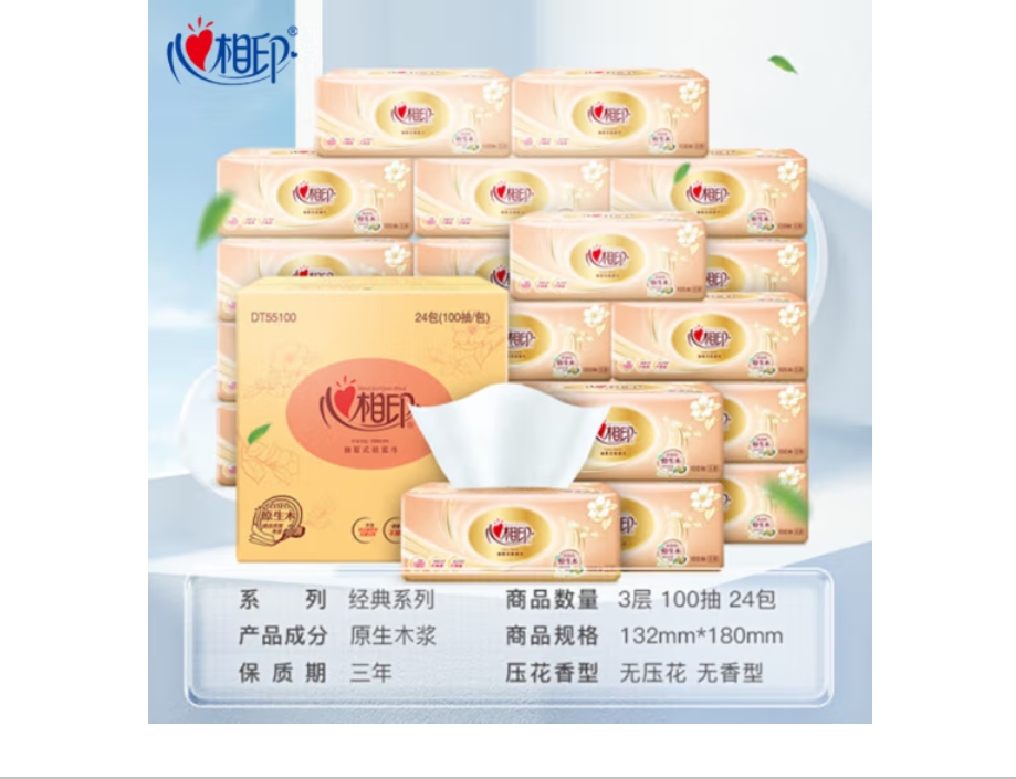 云杉生物 心相印 抽纸 金装经典300张*24包软抽 纸巾(3层100抽每包)箱装销售 XS码