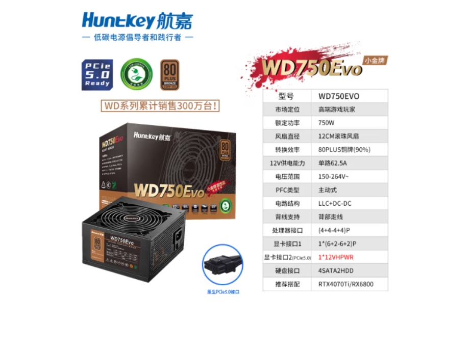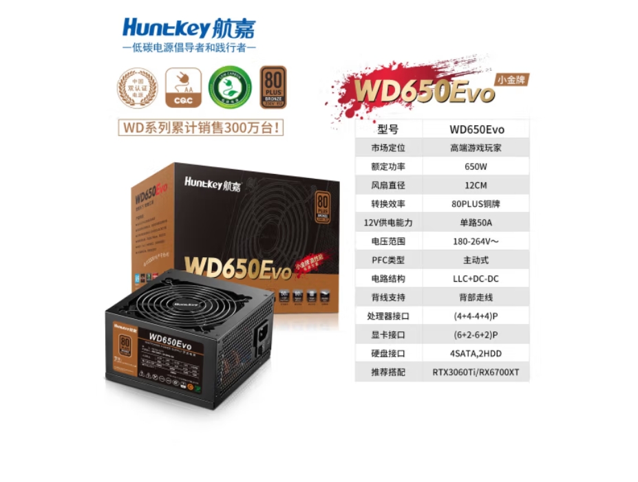 云栖漫心 航嘉(Huntkey)WD650Evo WD750Evo 铜牌650W 750W 电源(80PLUS铜牌/单路50A/全电压/LLC+SR+DC-DC/智能温控)