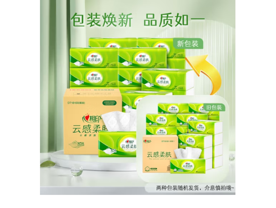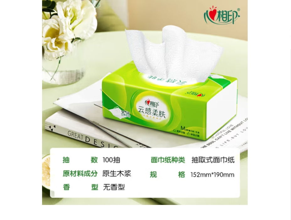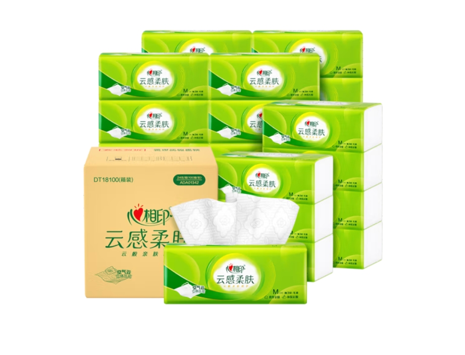 云栖漫心 心相印 抽纸 云感柔肤纸巾 真M码3层100抽*24包(整箱销售)