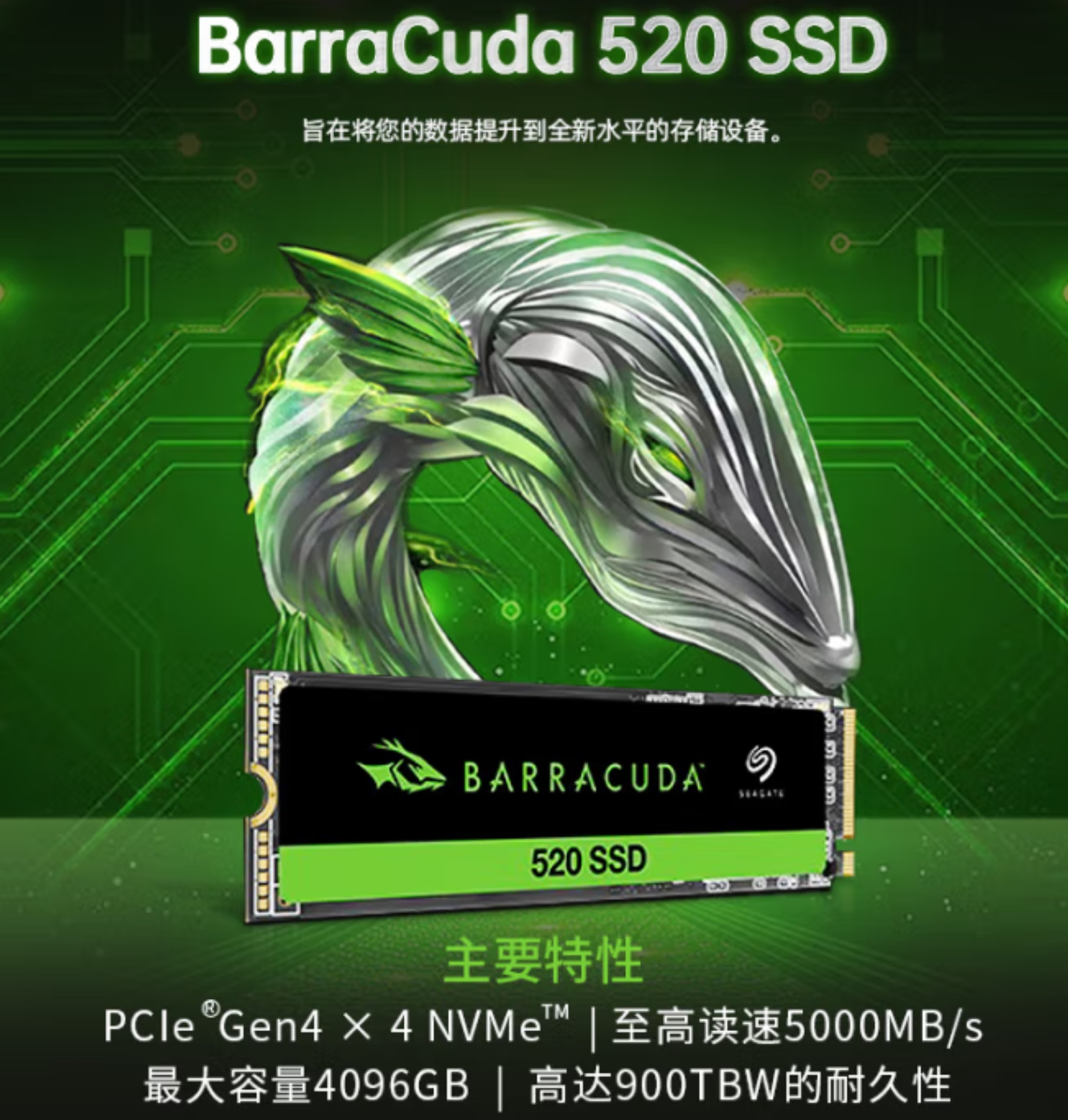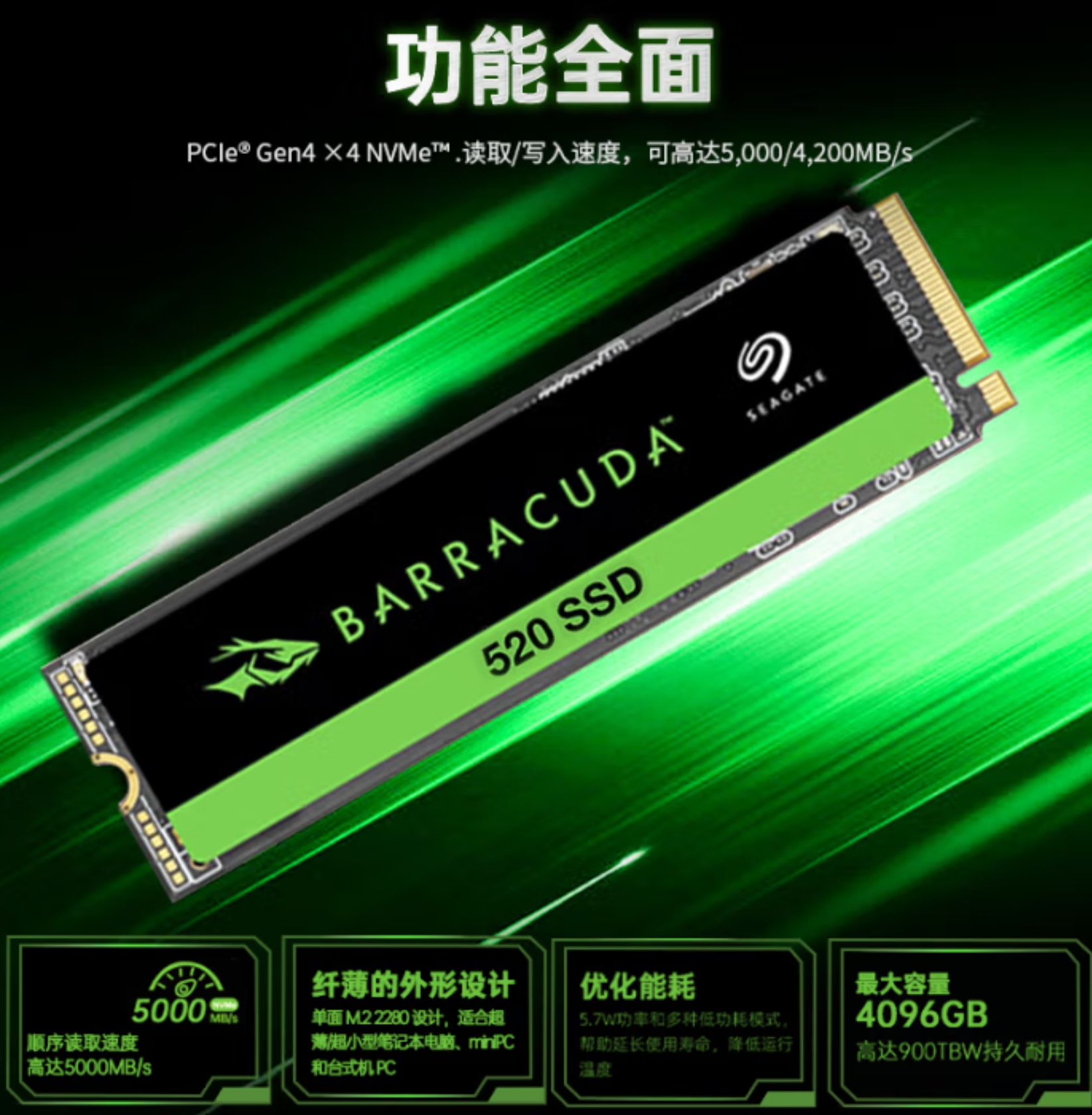 云杉生物 希捷(SEAGATE)1TB SSD固态硬盘 M.2接口(NVMe协议 PCIe4.0×4) 电竞玩家5000MB/s增速版 希捷酷鱼520