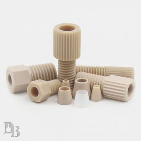 包装:5个/盒,规格:长度*直径:19.5*8.2*6.3mm,外螺纹:1/4-28UNF,适合管路外径:3.2mm,描述:材质:聚醚醚酮PEEK材质;颜色:本色;规格:总长:19.5mm,手拧部分直径:8.2*6.3mm,手拧部分长度:8.5mm,孔径3.2mm,外螺纹规格:1/4-28UNF,头端:扁头滚花,配套刃环:倒装;特点:耐腐蚀,耐高温,高纯度,低析出,分体式刃刀环和接头两部分组成,可防止安装时旋转扭曲,经济适用刃环可重复使用,部件损坏无需全套更换,适配岛津、安捷伦等液相色谱仪品牌;