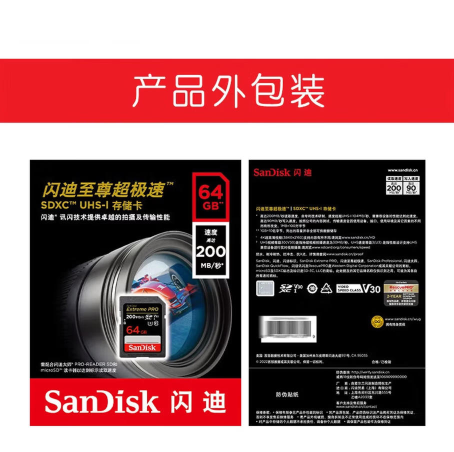 君航科技 闪迪(SanDisk)128GB SD内存卡 4K V30 U3 C10 相机存储卡 读速200MB/s 写速90MB/s 微单/单反相机内存卡