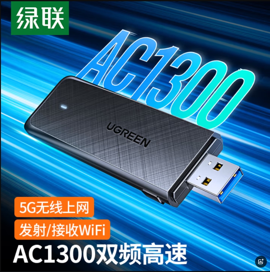 云栖漫心 绿联 USB无线网卡免驱动AC1300 台式机WiFi接收器 5G双频千兆高速 适用电脑笔记本通用WiFi发射器