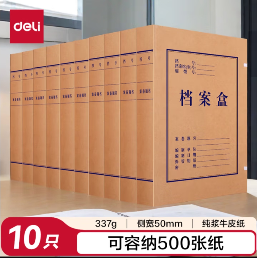 云栖漫心 得力 (deli) 10只50mm纯浆337g牛皮纸文件盒 加厚档案盒 财务用品 考试收纳 P05925 加厚款