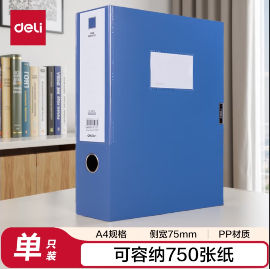 云栖漫心 得力 (deli) 75mm单只装A4粘扣档案盒塑料文件盒 财会文件收纳资料盒 办公用品 33512 蓝色