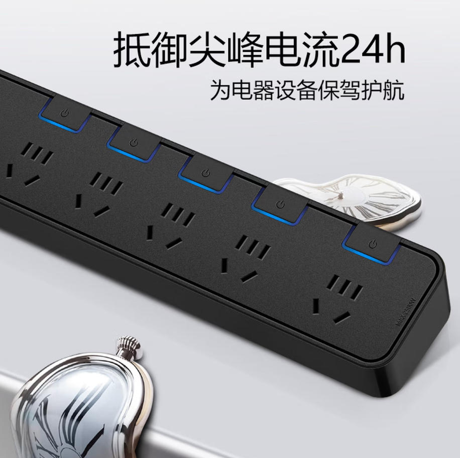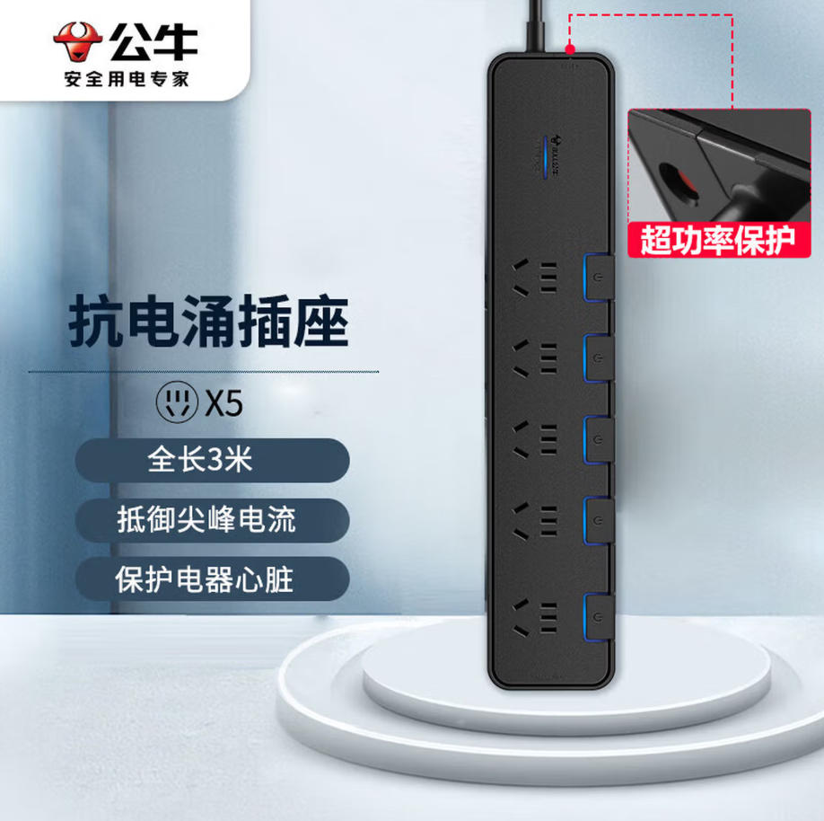 君航科技 公牛(BULL)抗电涌抗浪涌防雷电竞插座/插线板/插排/排插/接线板 5位分控全长3米 保护智能电器 GN-H3053