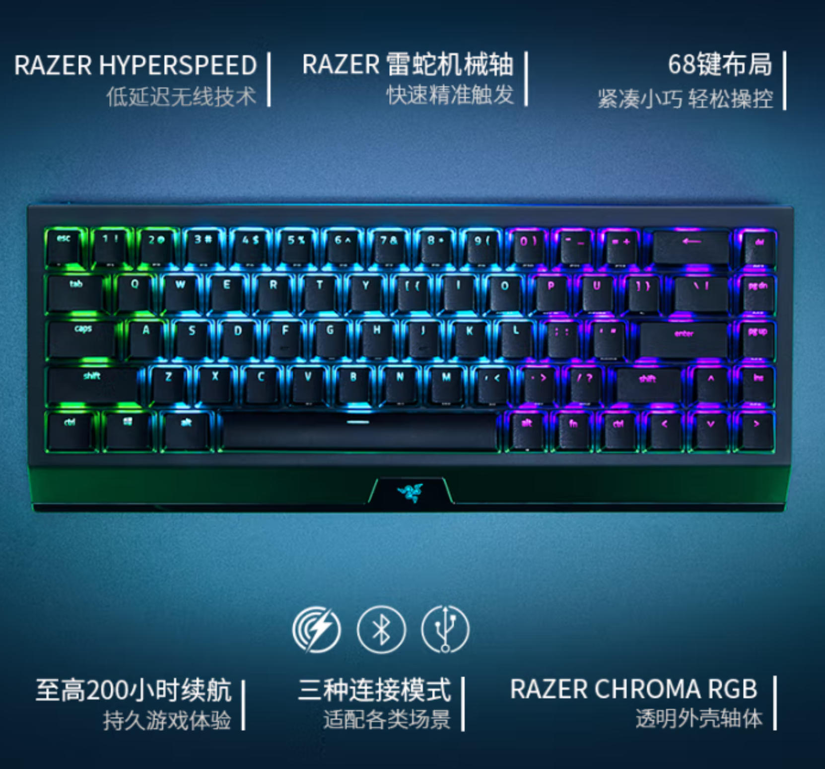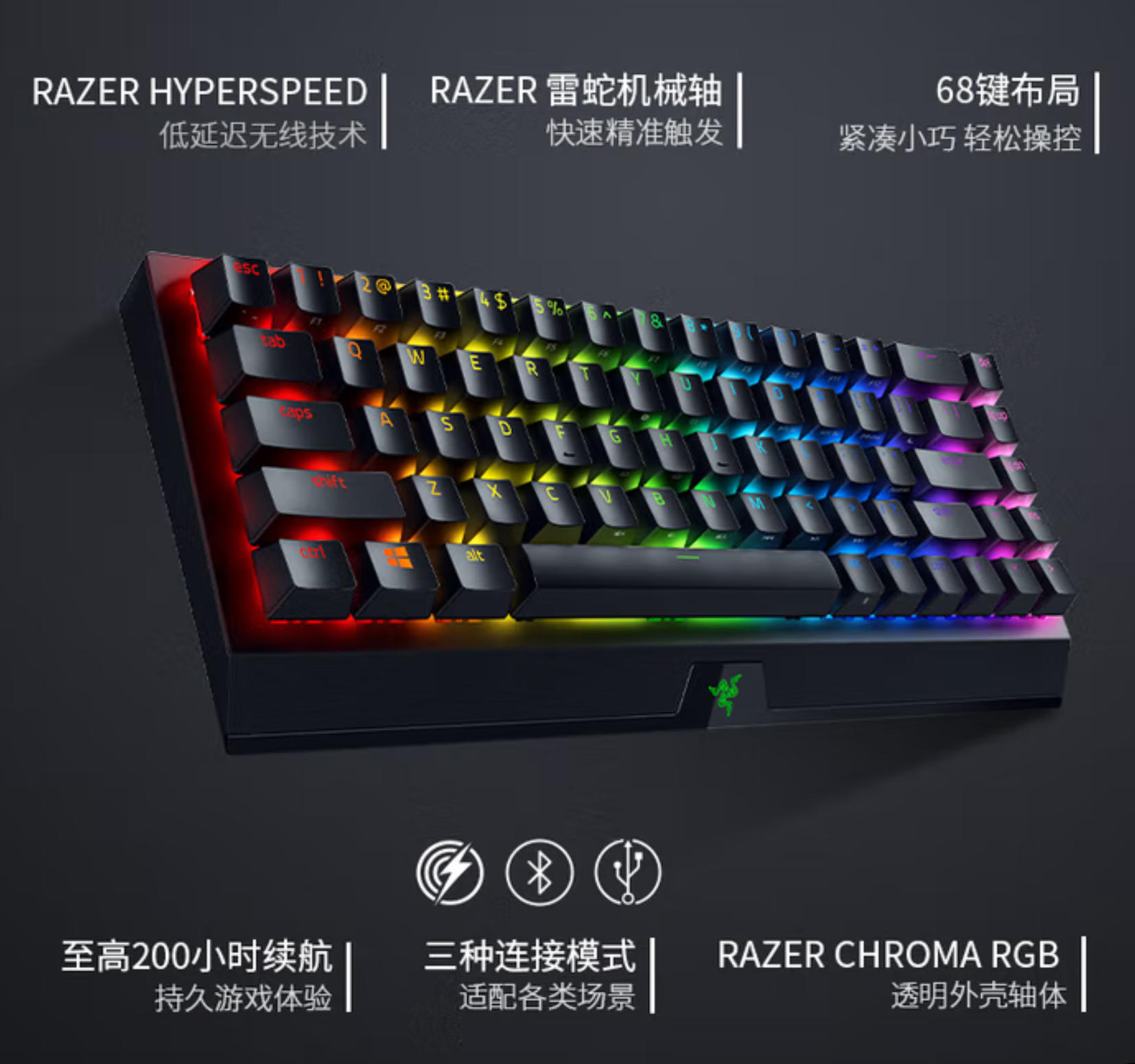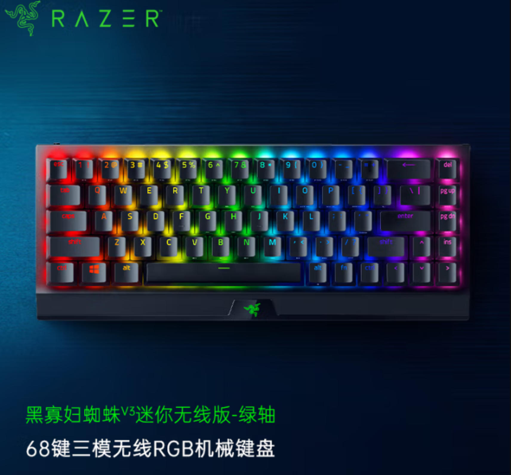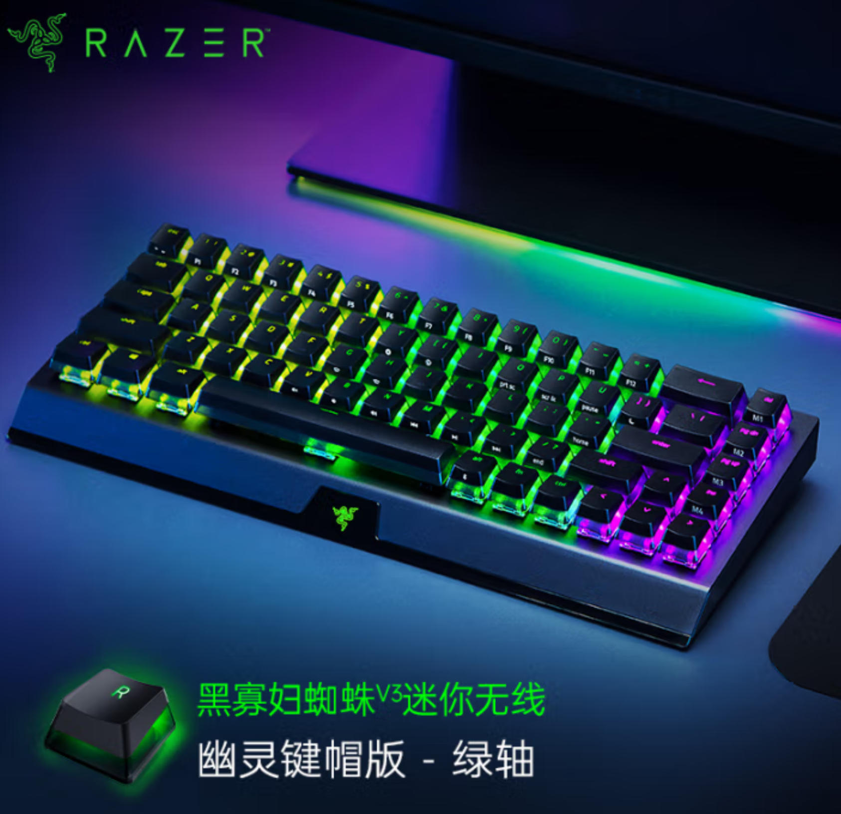 云杉生物 雷蛇(Razer)黑寡妇蜘蛛V3迷你无线幽灵键帽版 机械键盘 游戏键盘 68键 无线蓝牙有线键盘 RGB灯效 绿轴