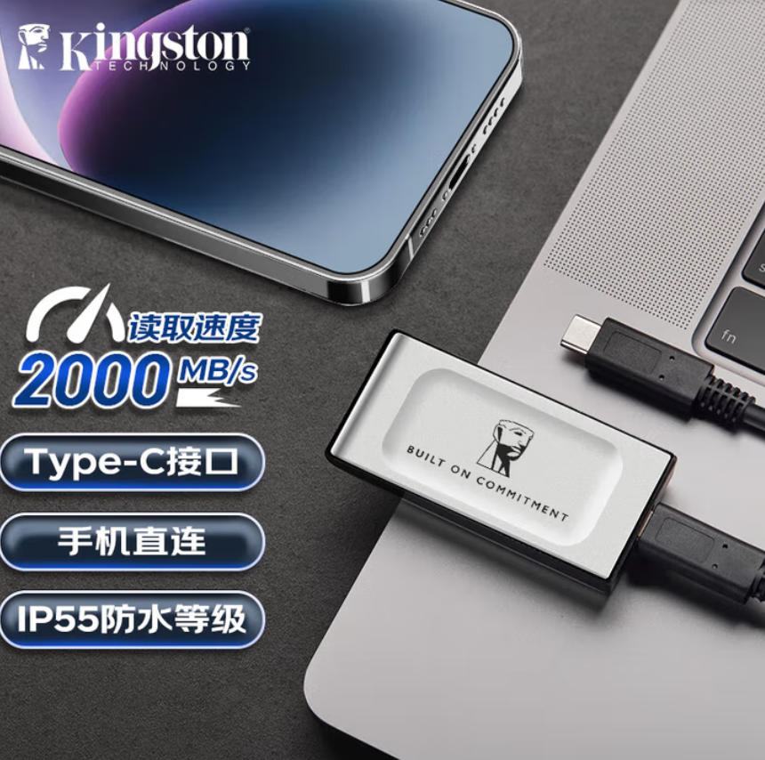 君航科技 金士顿(Kingston)1TB Type-C USB3.2 移动固态硬盘(PSSD)XS2000 高速读写2000MB/s IP55等级三防保护 手机直连 另有2T