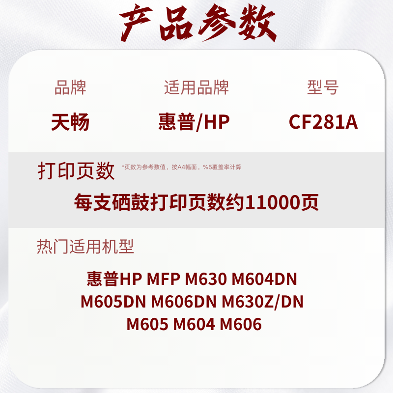 天畅CF281A黑鼓(易加粉带芯片) 适用于:惠普HP MFP M630 M604dn M605dn打印机 11000页 两支装(定点采购)