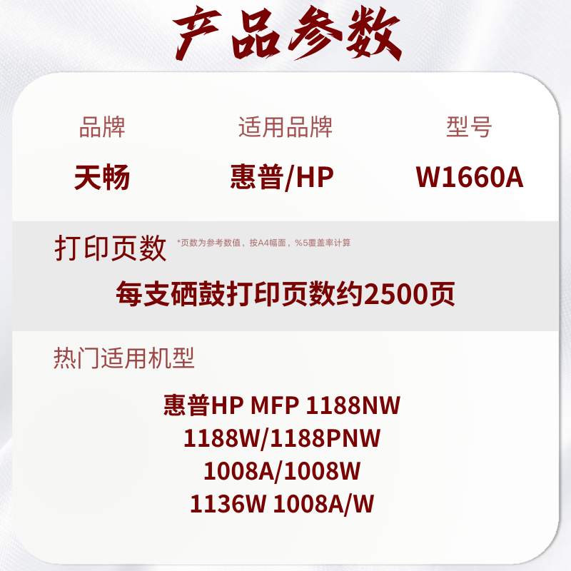 天畅W1660A黑鼓(易加粉 带芯片)适用于:惠普HP Laser 1008a / MFP1188 / 新1136w 打印机 2500页 十支装(定点采购)