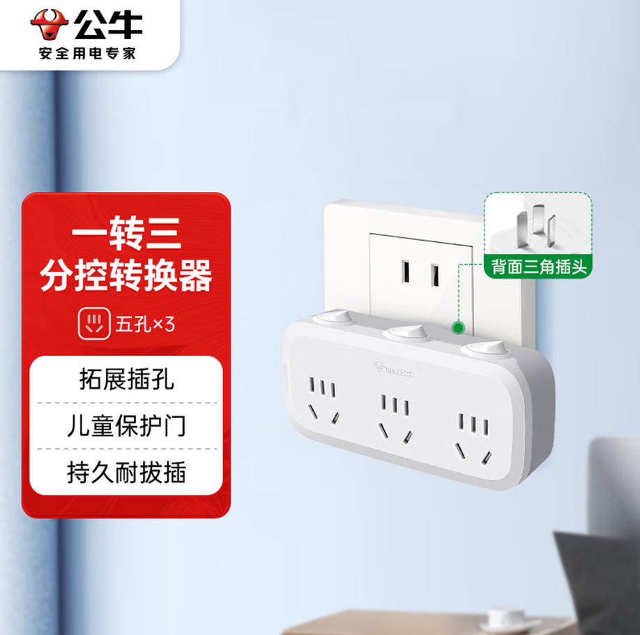 森淼办公 公牛(BULL)插座扩展器一转三/一转多插座/转换插头/转换器/插排 3位分控开关插座 GN-9333