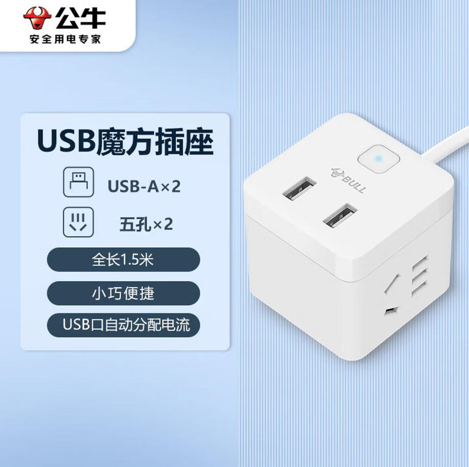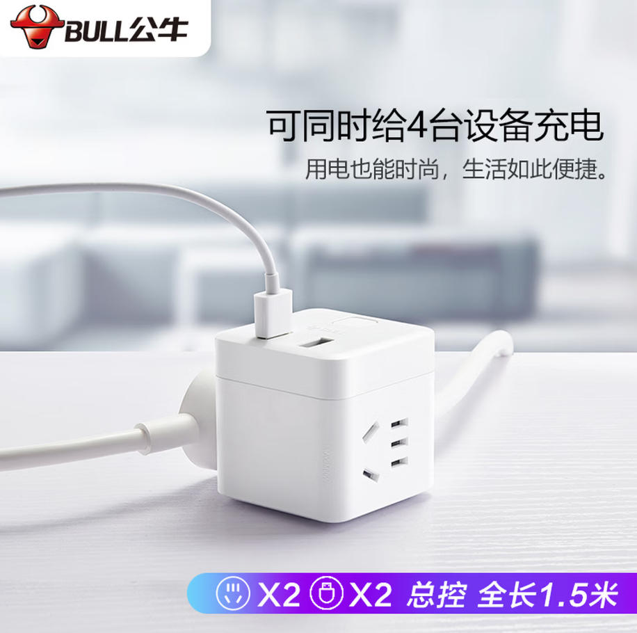 森淼办公 公牛(BULL)小魔方 USB插座 插线板/插排/排插/接线板 2孔+2USB口全长1.5米 GNV-UUB122总控开关