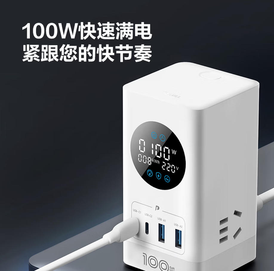 森淼办公 公牛(BULL)智能数显屏幕 氮化镓100W 快充插座 抗电涌 桌面插座 3C认证 黑色 白色 立式USB 总控开关2C2A+3插孔