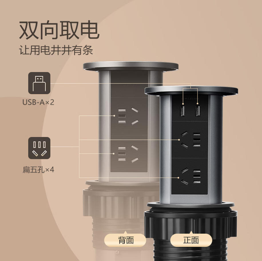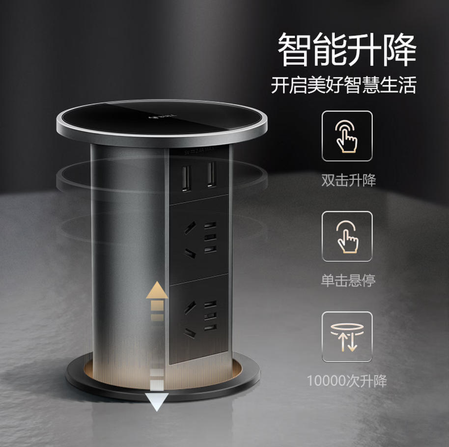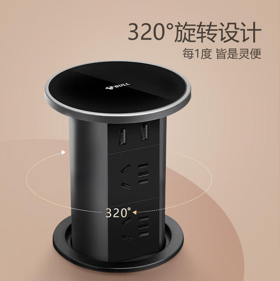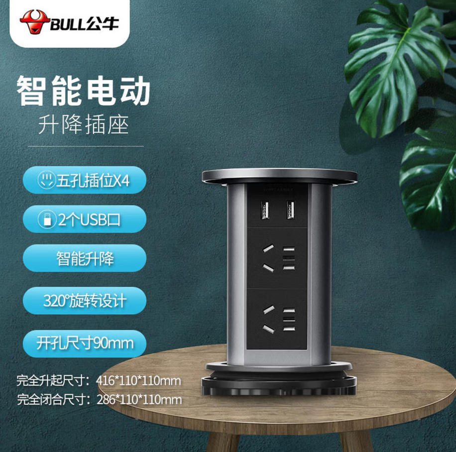 森淼办公 公牛(BULL)电动智能升降/隐藏式/嵌入式/多功能插座 办公室厨房会议室桌面 4位五孔+2USB 曜石黑 GN-SD104U 不带无线充