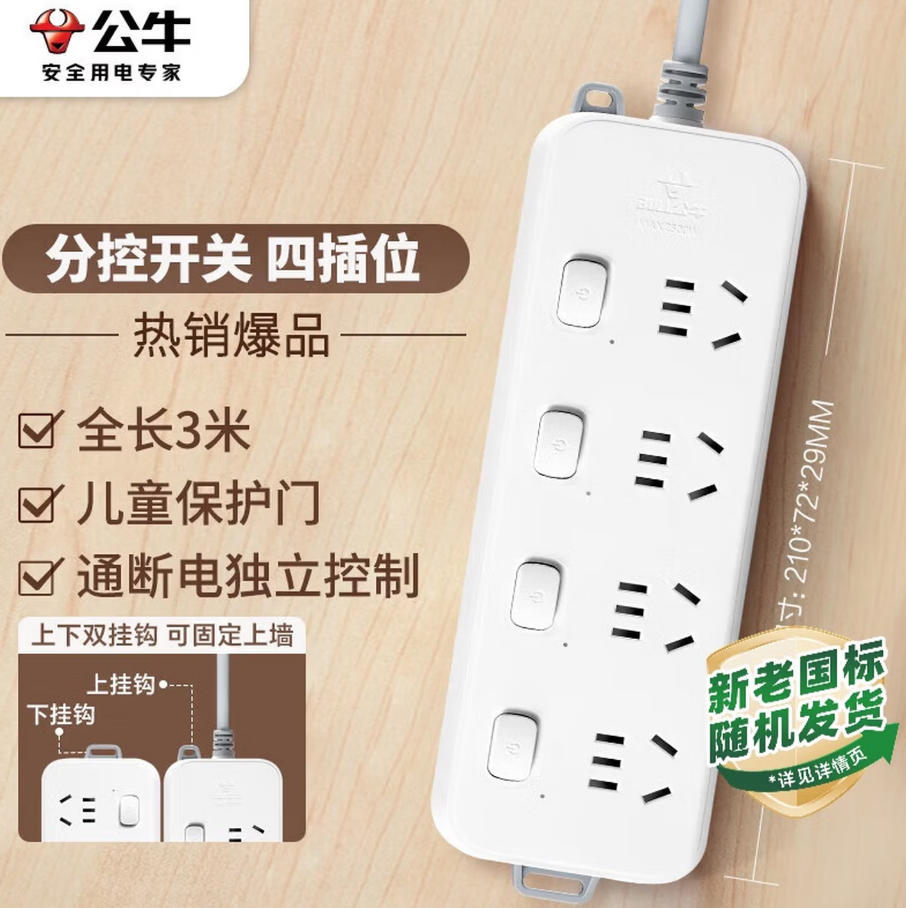森淼办公 公牛(BULL)分控插座/插线板/插排/排插/接线板 桌面拖线板 3C认证 4位分控全长3米 独立开关
