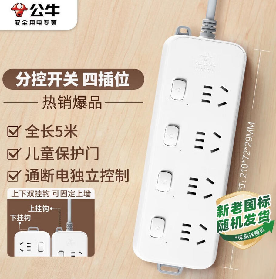 森淼办公 公牛(BULL)插座/插线板/插排/排插/接线板 桌面拖线板 3C认证 4位分控开关全长5米 GN-B3043