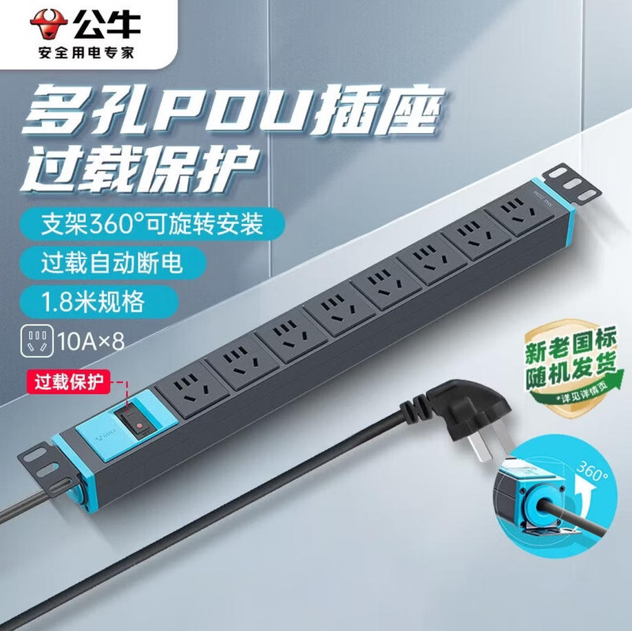 森淼办公 公牛(BULL)PDU桌面机柜插座/插线板/插排/排插/接线板 超功率保护防过载 8位总控开关1.8米规格 GNE-108E