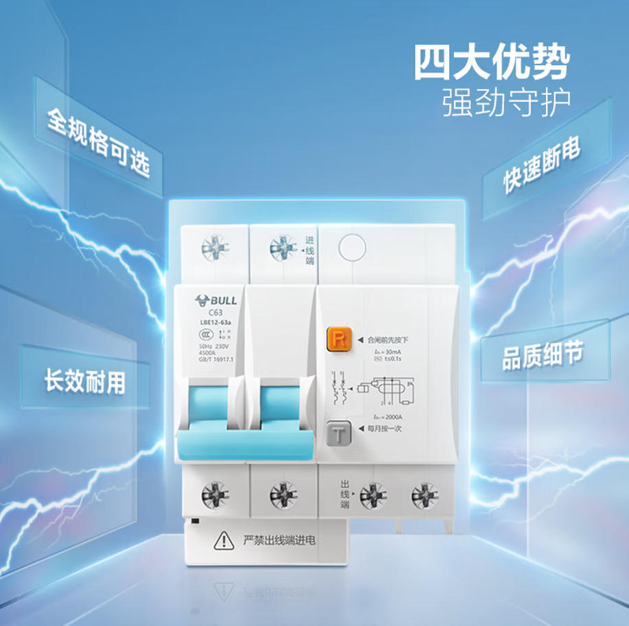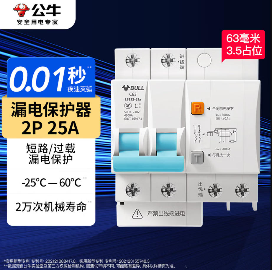 森淼办公 公牛(BULL)佳和LBE12漏电保护器 2P漏保断路器 家用空气开关 2P25A C25