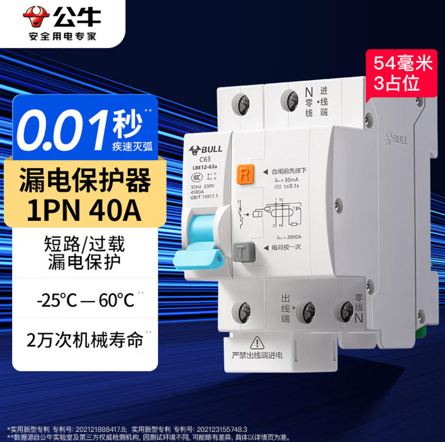 森淼办公 公牛(BULL)佳和LBE12-63a漏电保护器 1P+N漏保断路器 家用空气开关 1PN40A C40