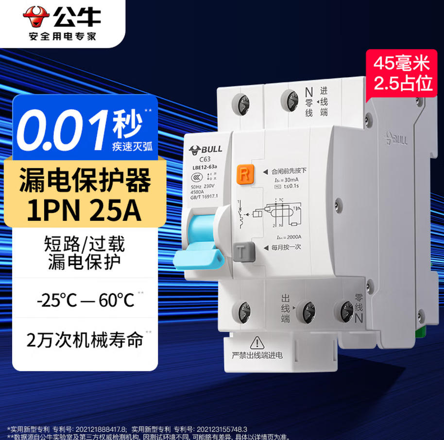 森淼办公 公牛(BULL)佳和LBE12-63a漏电保护器 1P+N漏保断路器 家用空气开关 1PN25A C25