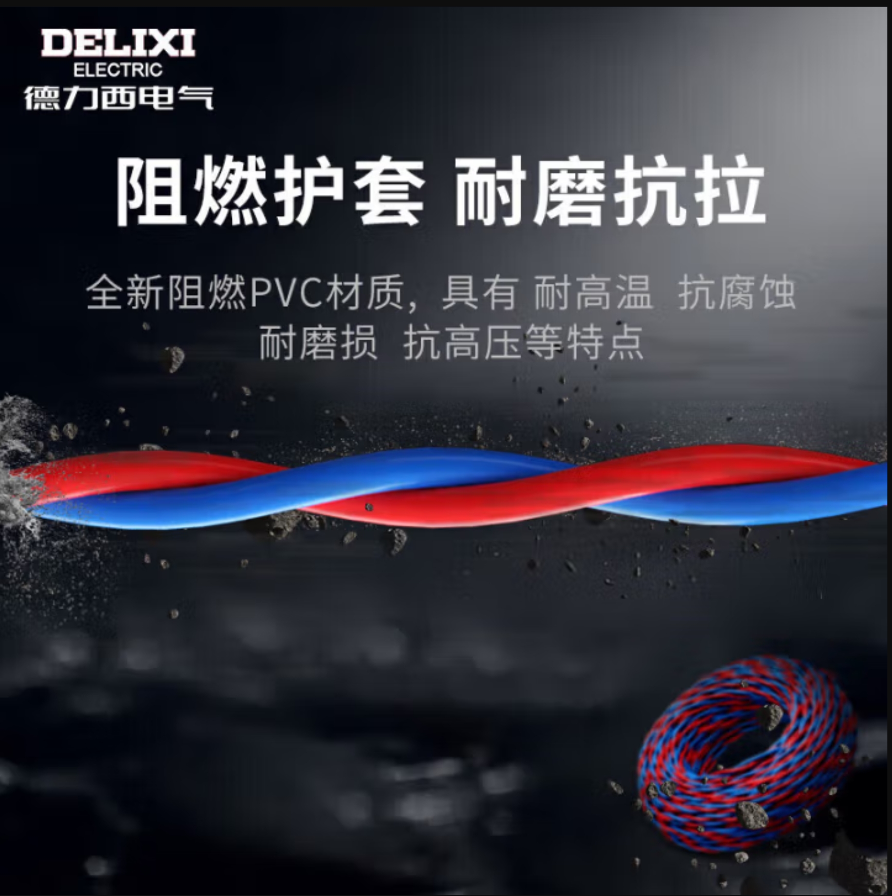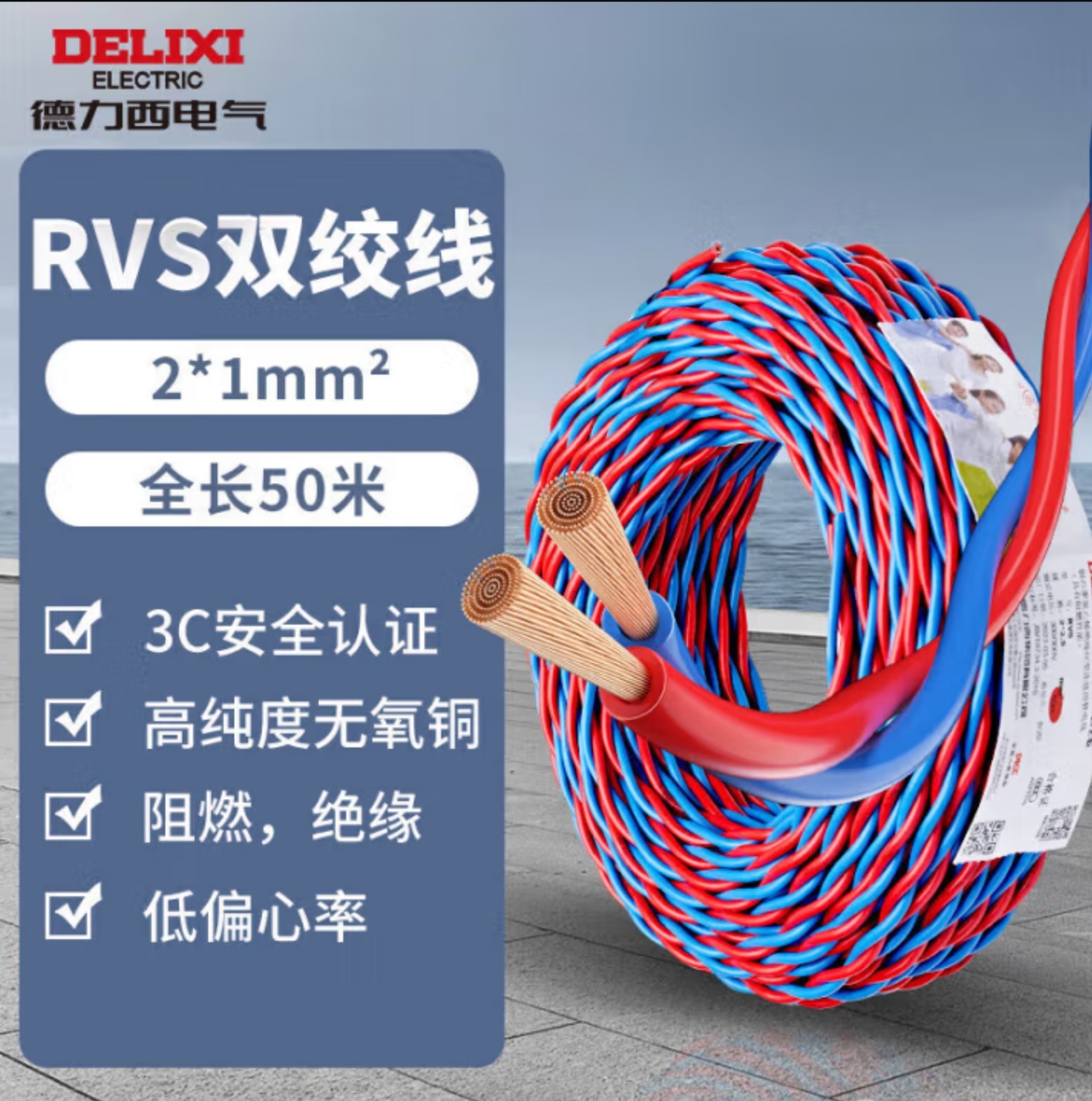 森淼办公 德力西电气 电线铜芯线 花线 双绞线 国标双股 RVS 2*1平方 红蓝双色 50米