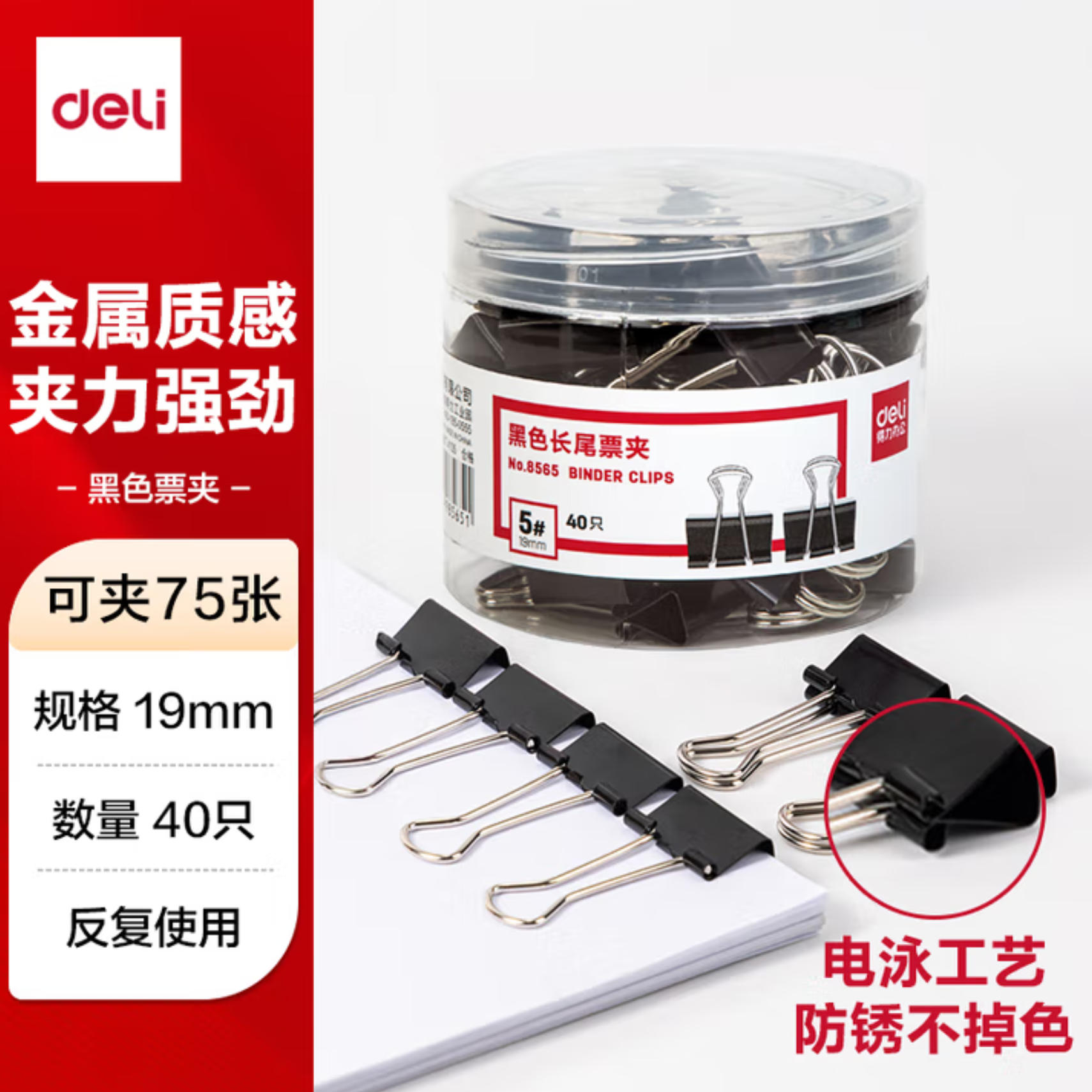 得力(deli) 40只19mm 黑色 长尾夹 票夹 金属燕尾夹 票据 文件夹 办公 40只/筒 小号8565