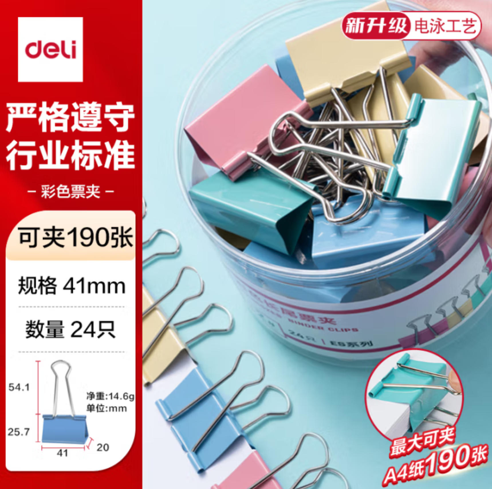 得力(deli) 24只41mm彩色长尾夹 票夹 2#大号 金属燕尾夹 票据 文件夹 办公 24只/筒 8552ES