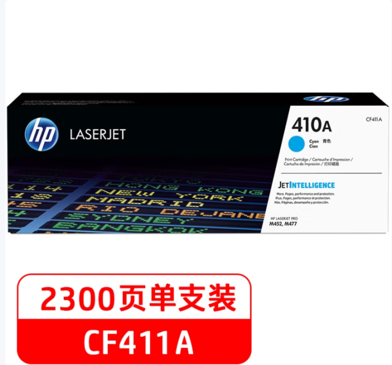 惠普(HP)410A(CF411A)原装硒鼓青色单支装(适用hp M452DN/m377dw/M452DW/M452NW/477fnw)打印页数2300