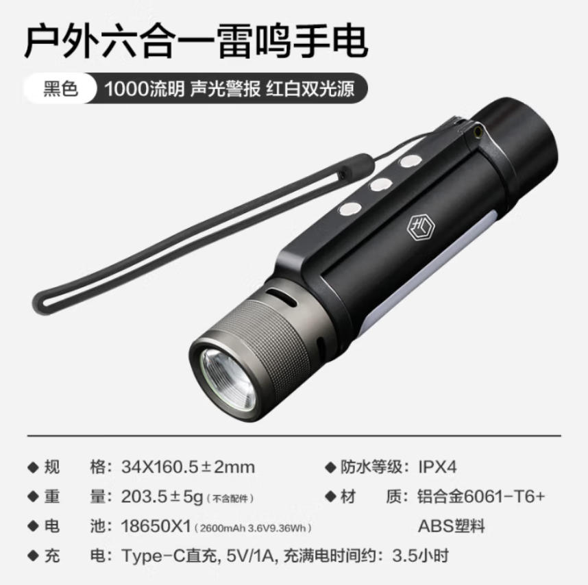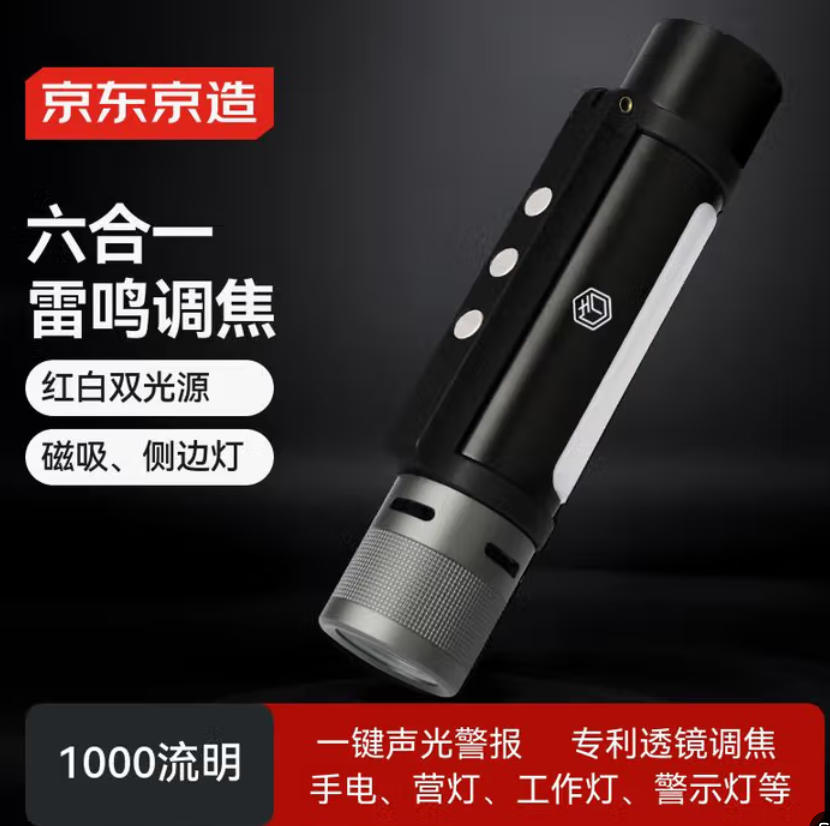云杉生物 京东京造 声光 雷鸣 手电筒 户外科研 强光 户外 变焦 手电 六合一 应急充电宝 多功能 磁吸救援