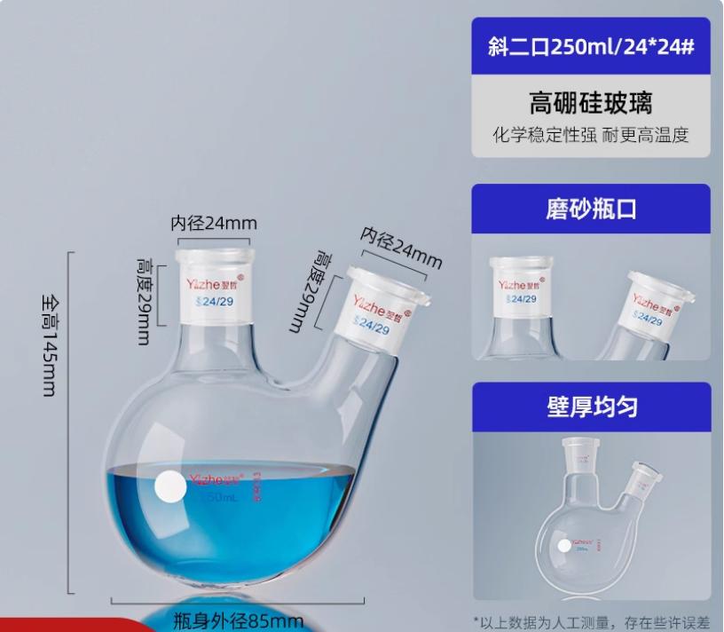 250ml/24*24#斜二口圆底烧瓶双口二颈烧瓶蒸馏反应瓶二口烧瓶/两口烧瓶/双颈烧瓶/二口圆底烧瓶/斜二口烧瓶/斜两口圆底烧瓶/二颈瓶/二口瓶/双口烧瓶