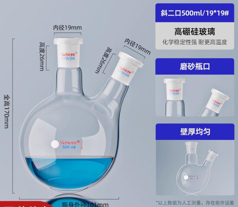 500ml/19*19#斜二口圆底烧瓶双口二颈烧瓶蒸馏反应瓶二口烧瓶/两口烧瓶/双颈烧瓶/二口圆底烧瓶/斜二口烧瓶/斜两口圆底烧瓶/二颈瓶/二口瓶/双口烧瓶