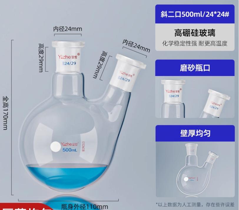 500ml/24*24#斜二口圆底烧瓶双口二颈烧瓶蒸馏反应瓶二口烧瓶/两口烧瓶/双颈烧瓶/二口圆底烧瓶/斜二口烧瓶/斜两口圆底烧瓶/二颈瓶/二口瓶/双口烧瓶