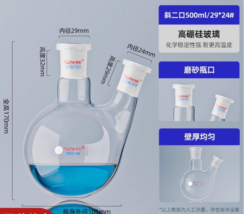 500ml/29*24#斜二口圆底烧瓶双口二颈烧瓶蒸馏反应瓶二口烧瓶/两口烧瓶/双颈烧瓶/二口圆底烧瓶/斜二口烧瓶/斜两口圆底烧瓶/二颈瓶/二口瓶/双口烧瓶