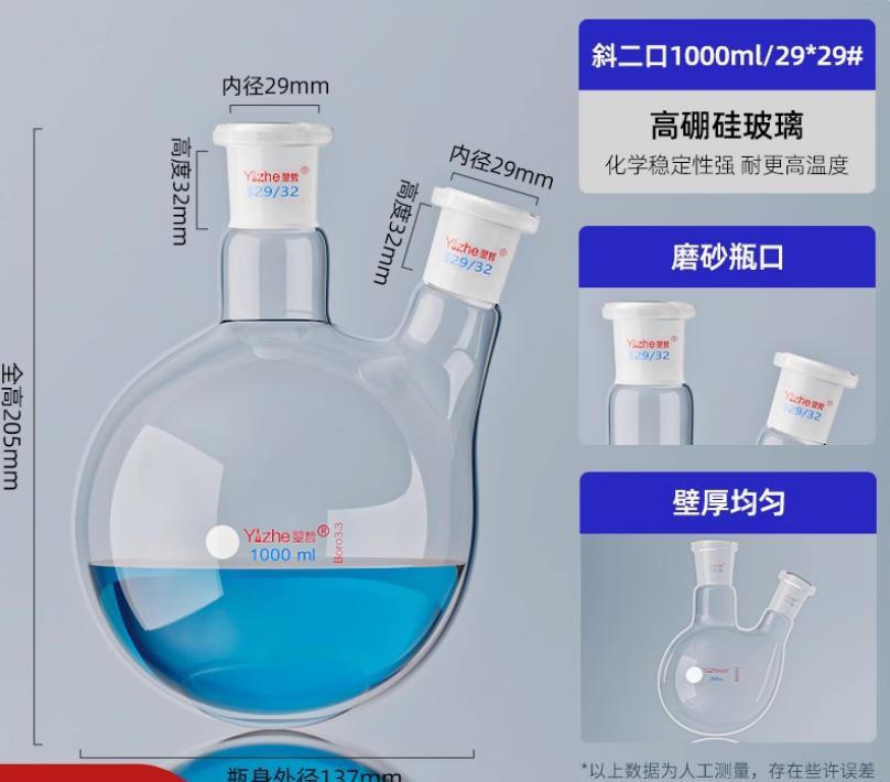 1000ml/29*29#斜二口圆底烧瓶双口二颈烧瓶蒸馏反应瓶二口烧瓶/两口烧瓶/双颈烧瓶/二口圆底烧瓶/斜二口烧瓶/斜两口圆底烧瓶/二颈瓶/二口瓶/双口烧瓶