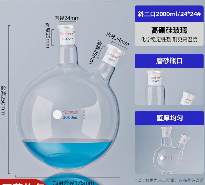 2000ml/24*24#斜二口圆底烧瓶双口二颈烧瓶蒸馏反应瓶二口烧瓶/两口烧瓶/双颈烧瓶/二口圆底烧瓶/斜二口烧瓶/斜两口圆底烧瓶/二颈瓶/二口瓶/双口烧瓶