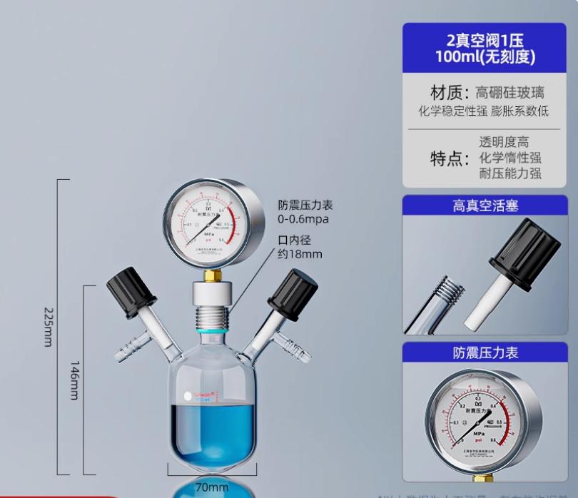 100ml 2真空阀1压 厚壁高真空耐压瓶 负压瓶 压力瓶 螺纹口缓冲瓶 密封罐 具压力表 气体收集加压取样瓶 抽真空反应瓶带测温