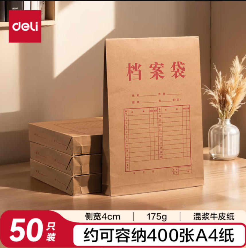 森淼办公 得力(deli) 50只A4混浆175g牛皮纸档案袋商品袋 侧宽4cm 标书合同文件票据资料袋 办公用品33474