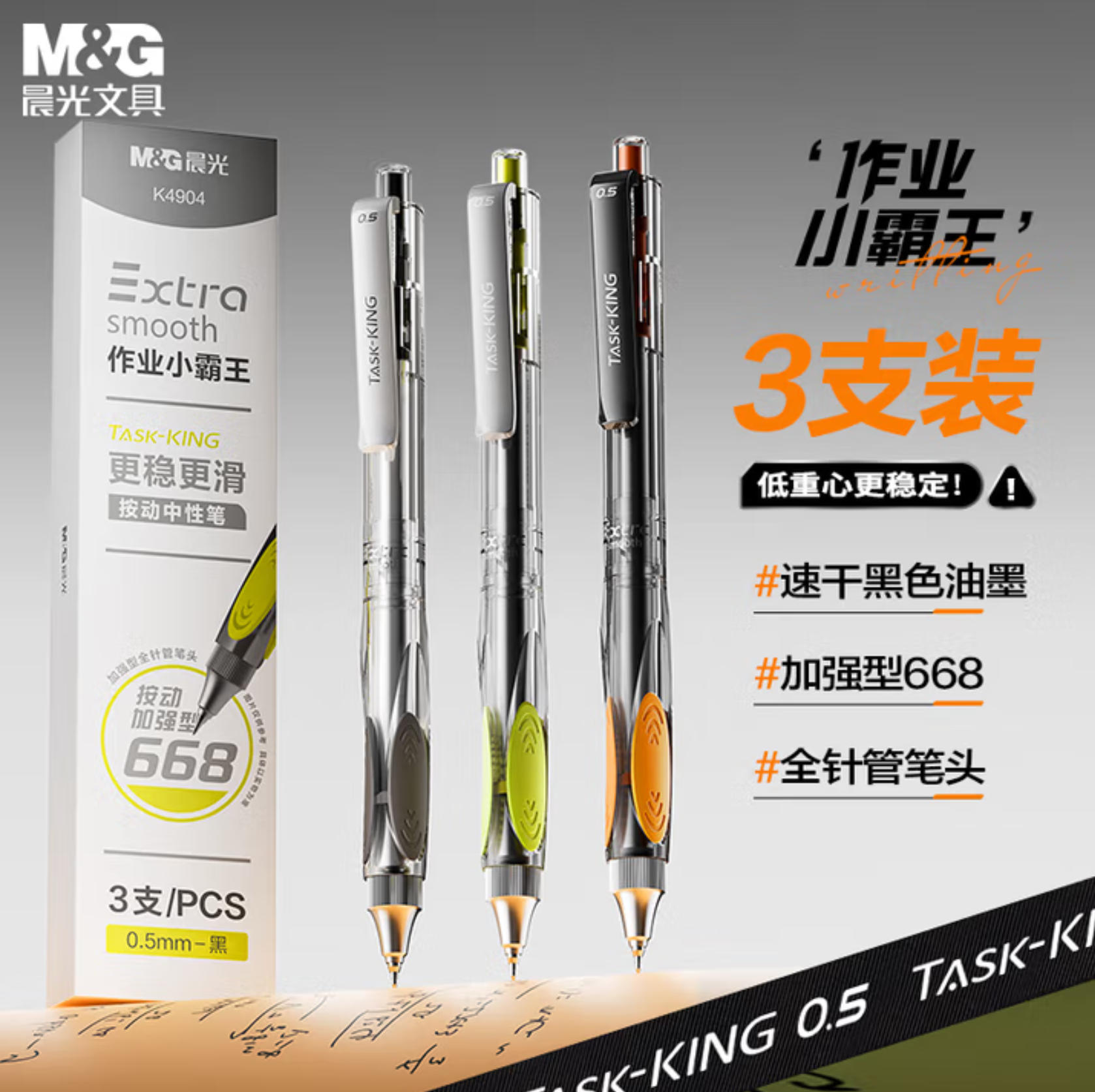 森淼办公 晨光(M&G)文具 小霸王 按动中性笔 学生0.5 黑笔 签字笔 加强型 668全针管 考试专用 水笔 高颜值 黑色 3支 AGPK4904A