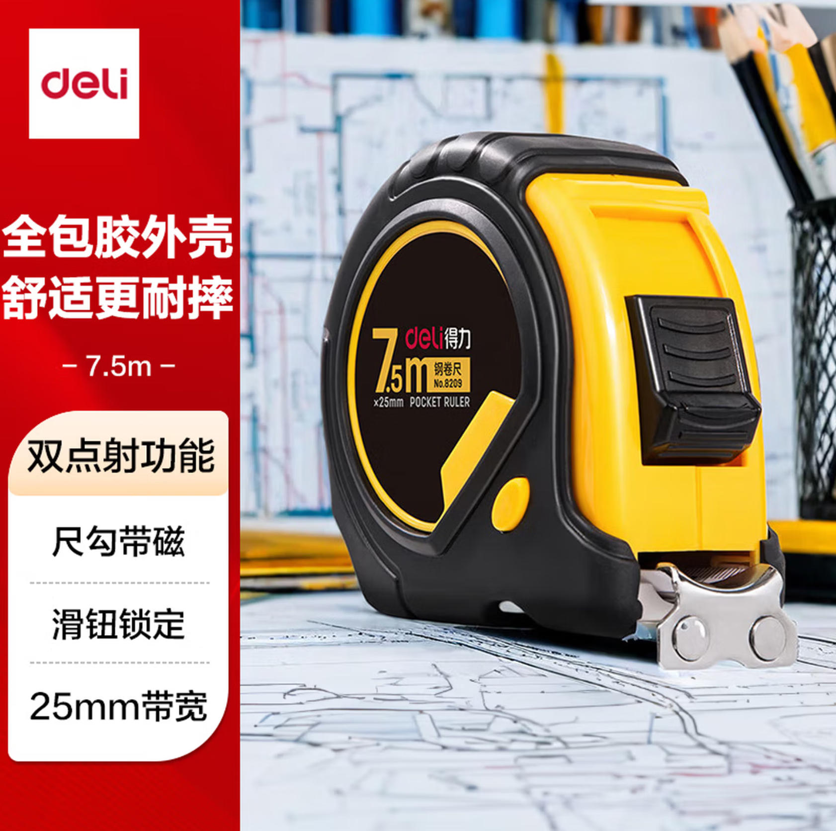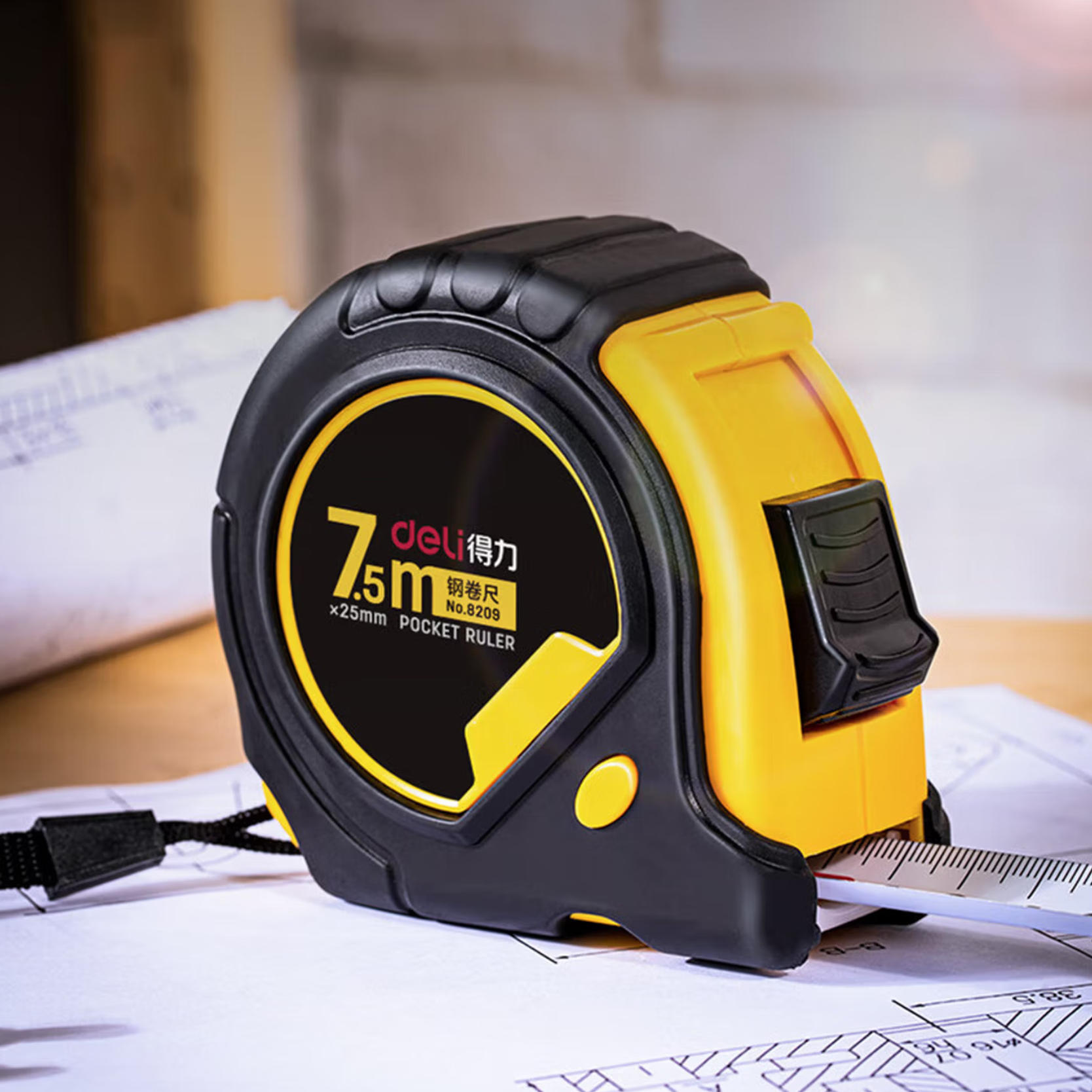 莱英办公 得力 (deli)7.5m 全包胶带 锁定钢卷尺 测量尺 办公用品 8209 黄色