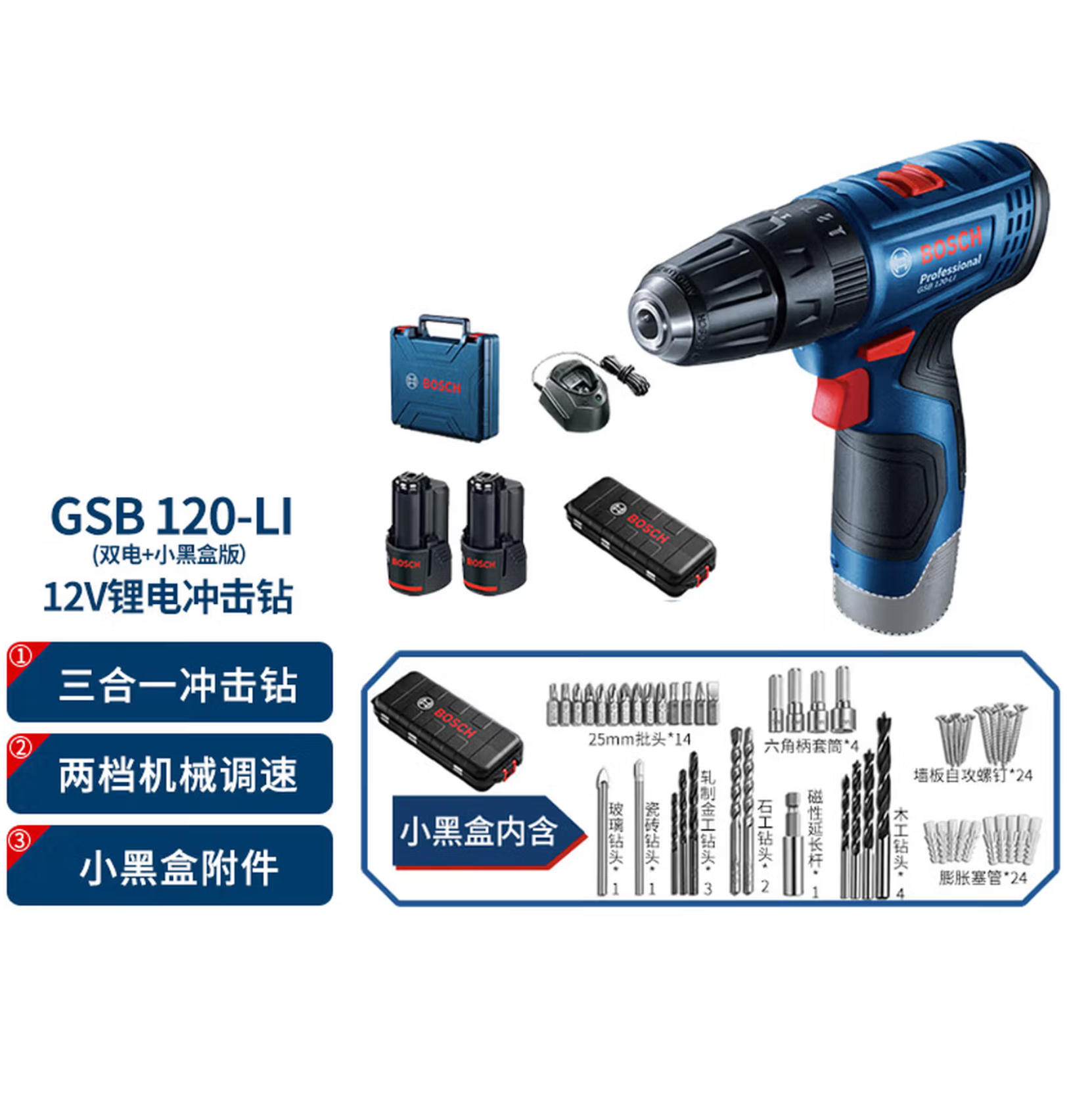 博世(BOSCH)电钻 钻墙 打孔 多功能 螺丝刀 GSB120 双电12V锂电+小黑盒附件箱