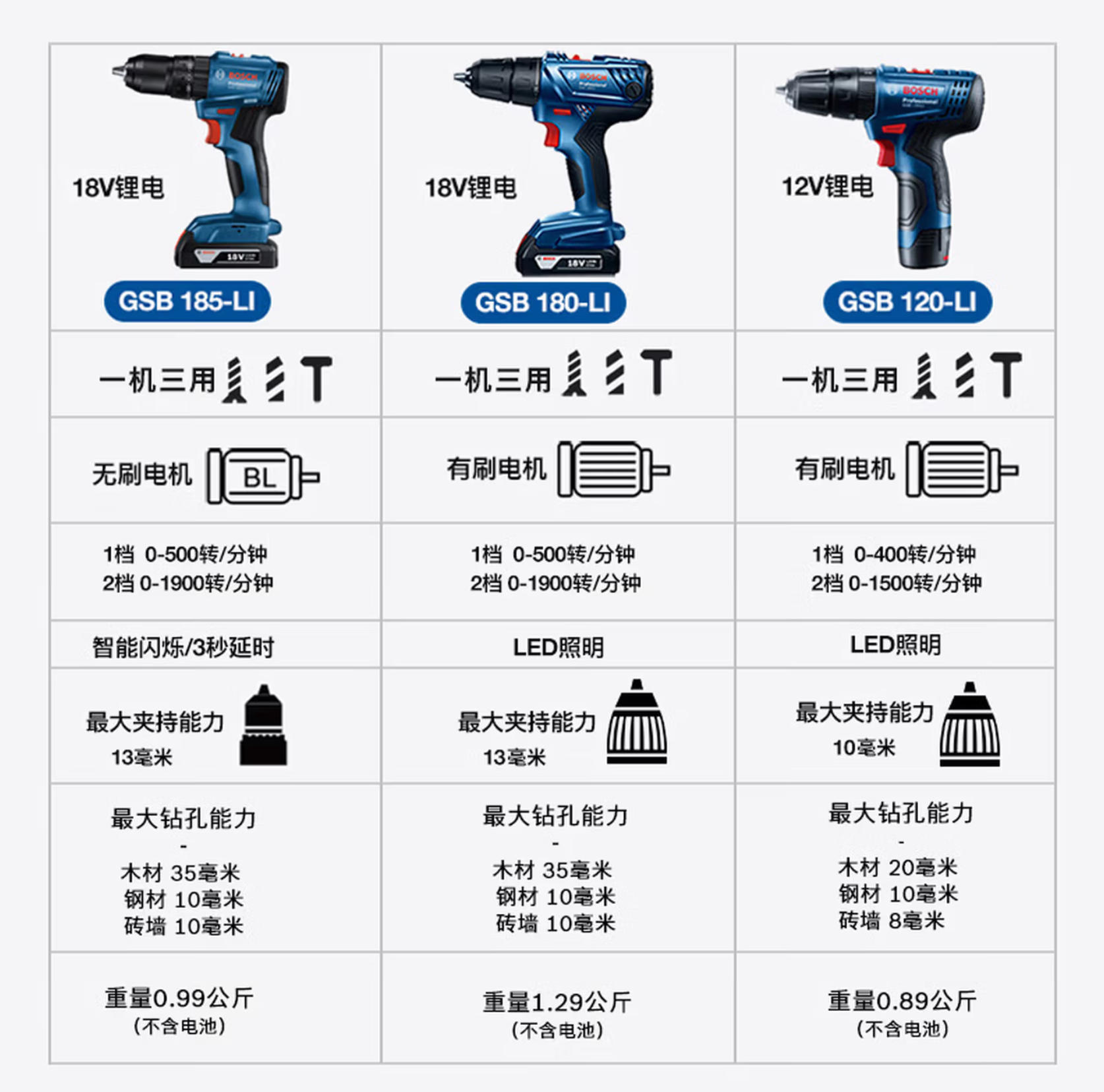 博世(BOSCH)电钻 钻墙 打孔 起拧 无刷 锂电冲击钻 电动螺丝刀 GSB185 18V 2.0Ah双电