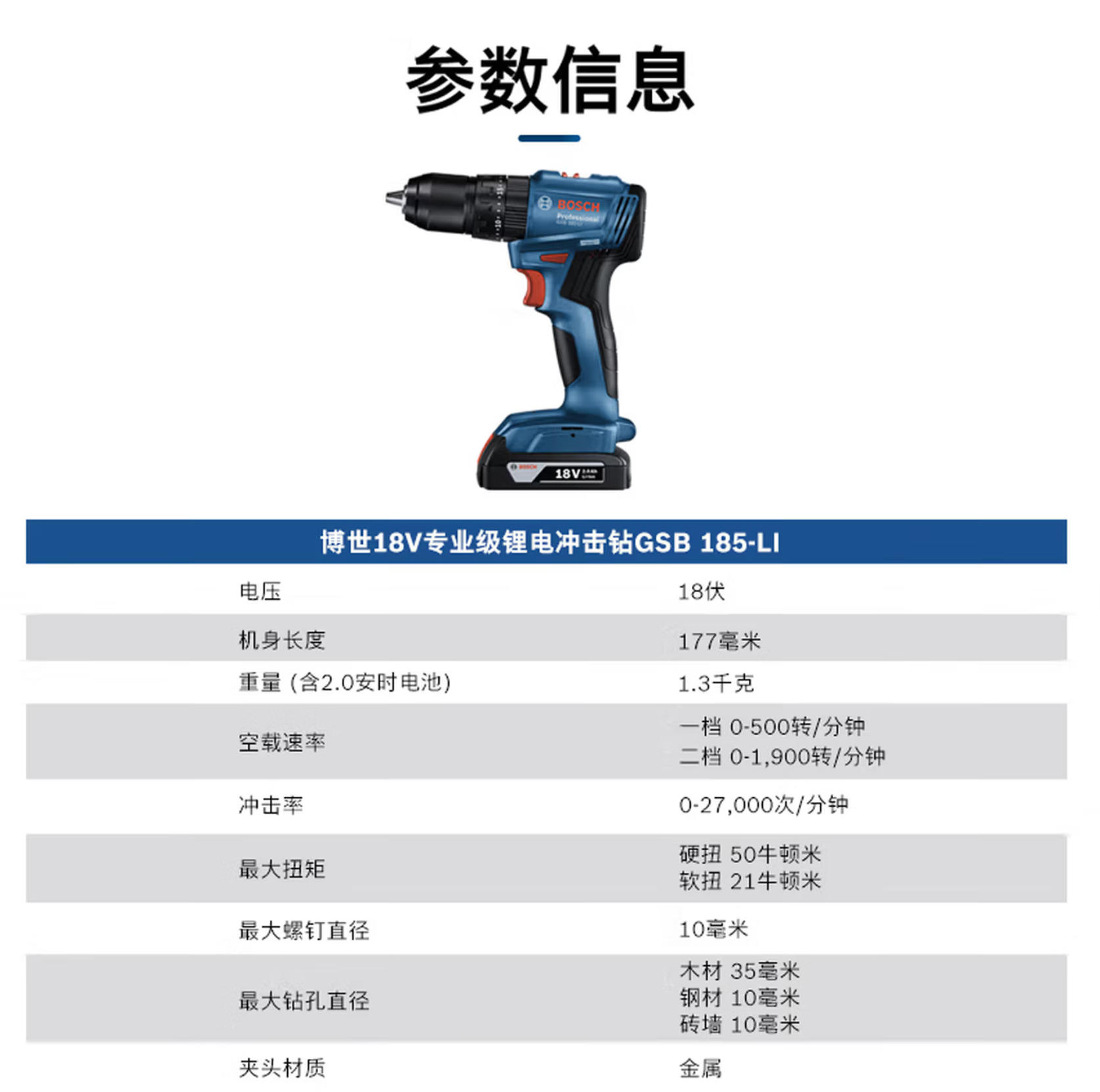 博世(BOSCH)电钻 钻墙 打孔 无刷 锂电冲击钻 电动螺丝刀 GSB185 18V 2.0Ah单电