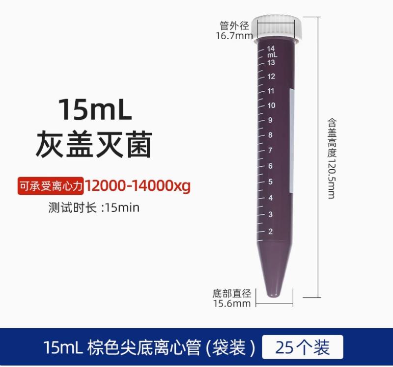 15ml离心管塑料高速无菌尖平底可立式螺旋拧盖离心管试管采样菌种分样瓶 棕色灰盖 25个