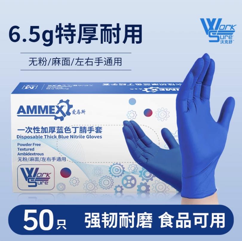 爱马斯一次性蓝色丁腈手套加厚耐用丁腈手套 特厚耐用手套 50支