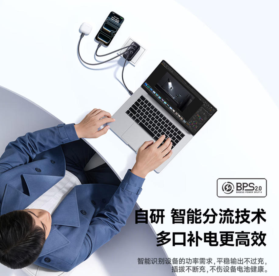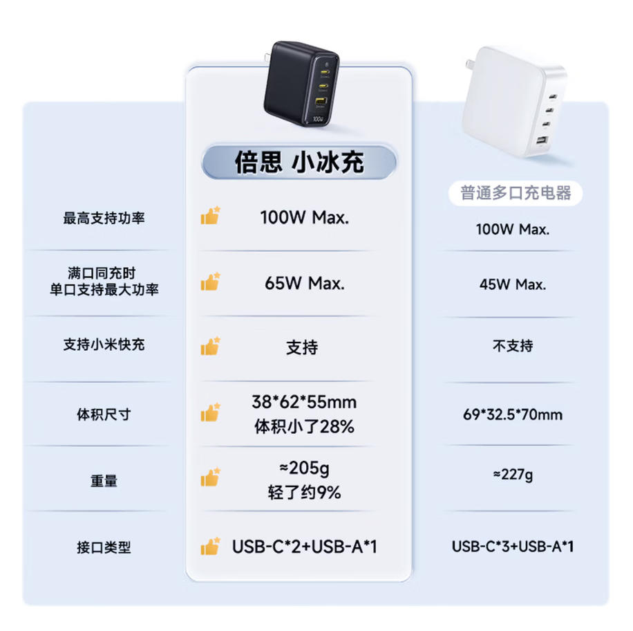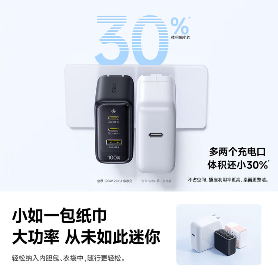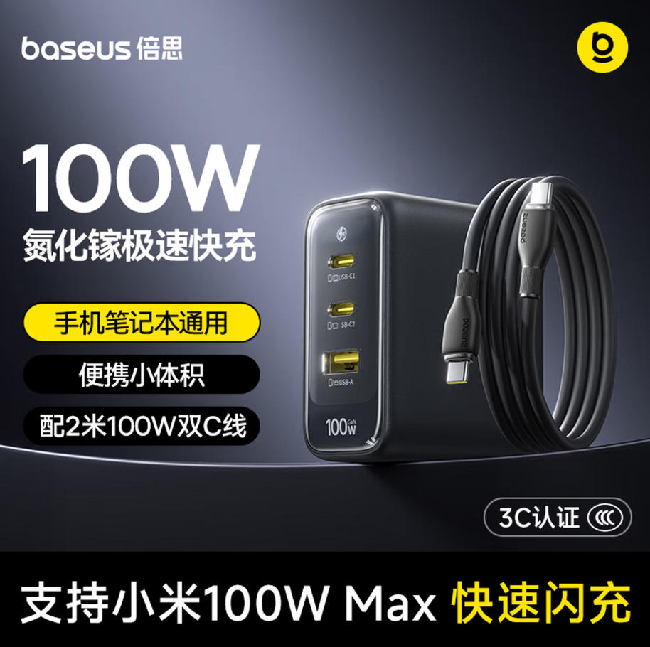 莱英办公 倍思 小冰充 氮化镓充电器套装100W一拖三pd大功率 快充头 适用苹果17小米华为荣耀手机平板笔记本插头 黑