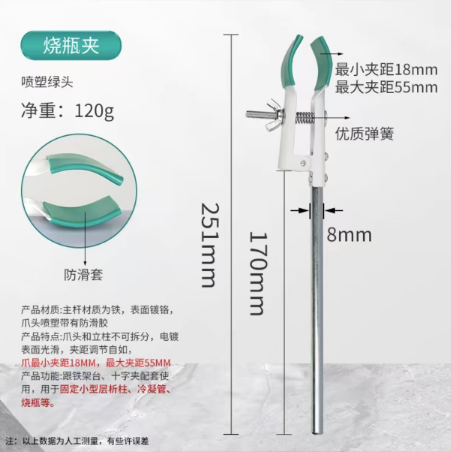 产品材质:主杆材质为铁,表面镀铬,爪头喷塑带有防滑胶产品特点:爪头和立柱不可拆分,电镀表面光滑,夹距调节自如,爪最小夹距18MM,最大夹距55MM产品功能:跟铁架台、十字夹配套使用,用于固定小型层析柱、冷凝管、烧瓶等。